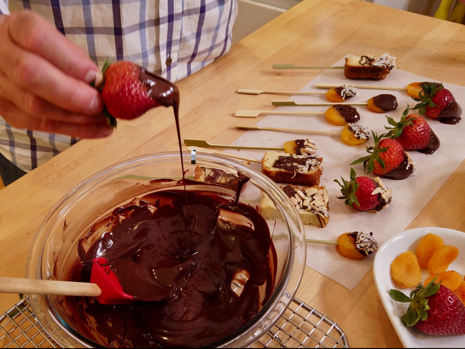 Melt the chocolate in the top of a double boiler, scraping down the sides with a rubber spatula to avoid overheating. As the chocolate begins to melt, remove the bowl from the heat.