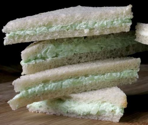 In a food processor - mix 1 package softened cream cheese with 2 Tablespoons finely chopped watercress, 1/4 of a finely chopped Vidalia onion, 2 Tablespoons of olive oil mayo, a shot of hot sauce, and a pinch of sea salt. Pulse all ingredients until just blended smooth. Fold in 1 large peeled, seeded and finely chopped English cucumber. Spread cuke filling on thinly sliced white sandwich bread. Trim crusts, if desired.