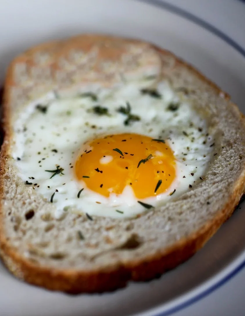 All you need here is one slice of good bread + one good *pastured egg. Make a hole in the center of the bread. Add a small amount of butter, olive oil, or a little fat from cooked bacon or breakfast sausage in a pre-heated egg pan. Crack an egg in the center of the hole, cook for one minute, and flip (or turn with a spatula). Cook both sides. Top with fresh herbs such as chives, thyme & parsley. Serve immediately; toad optional!